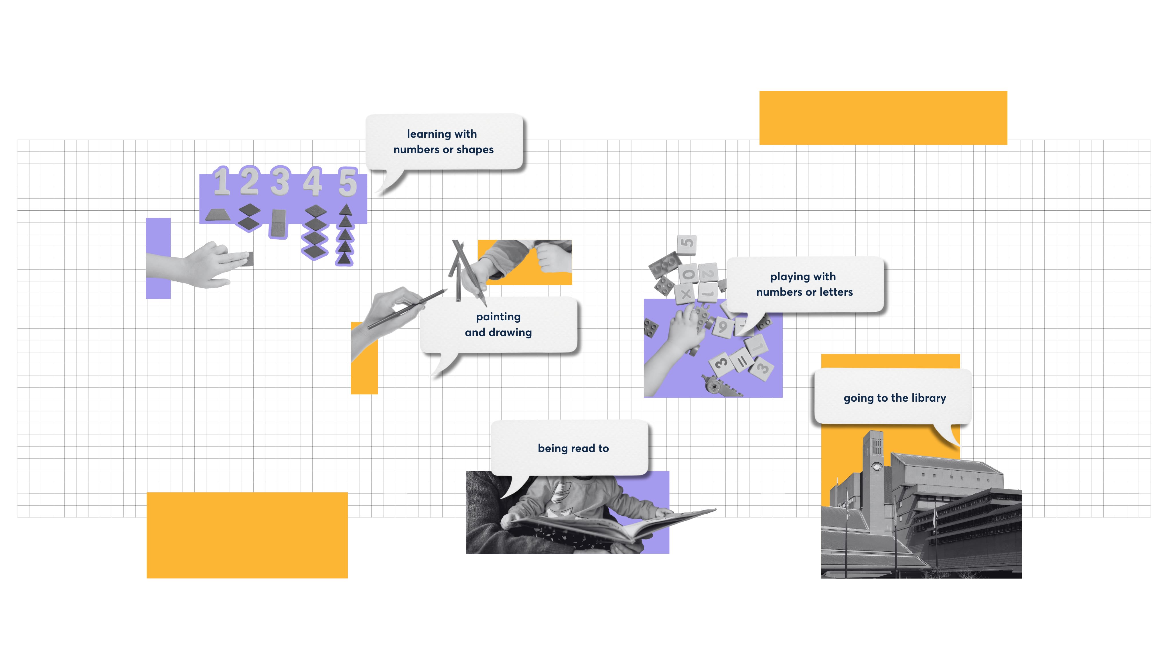 A child’s home learning environment (HLE) refers to aspects of home life that support learning, including the frequency and quality of joint activities between caregivers and children. This includes things like talking and reading together, singing songs or playing educational games. It also includes access to materials that enable these activities, like books and toys. The graphic below shows an example of some of the activities that researchers identify to understand the quality of the home learning environment.